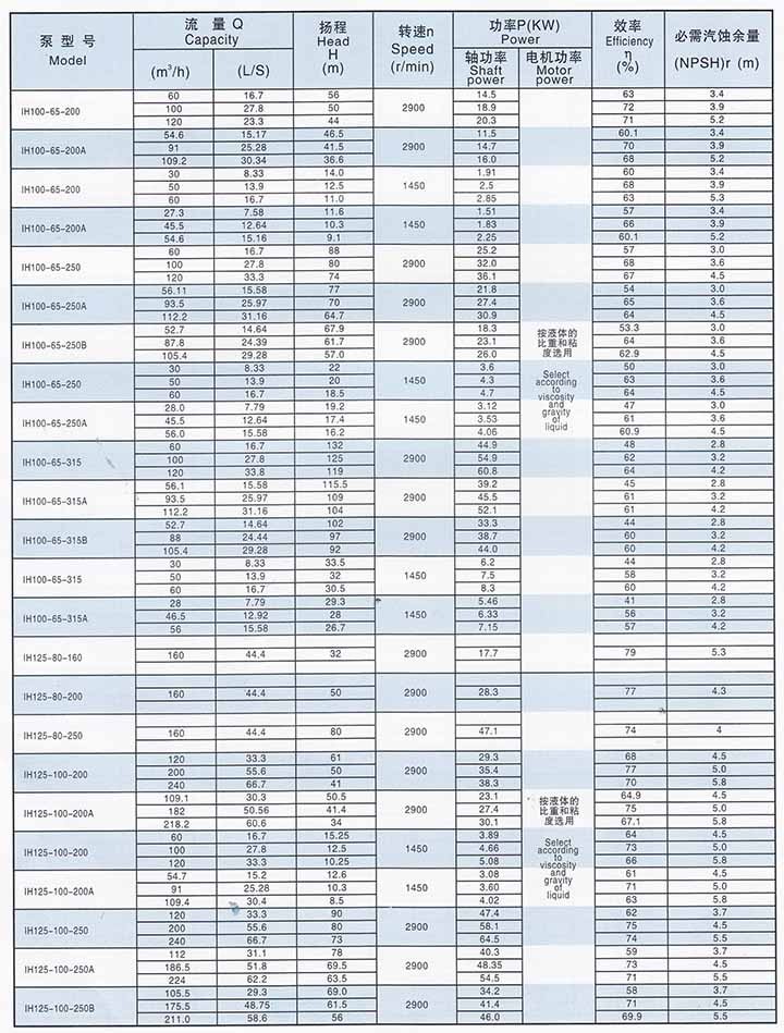 概述: IH型泵是單級單吸(軸向吸入)耐腐蝕離心泵,供輸送不含固體顆粒、具有腐蝕性、粘度類似水的液體。介質(zhì)溫度為-20℃~105℃,需要時采用冷卻措施溫度可更高。適用于石油、化工、冶金、電力、造紙、食品、制藥和合成纖維等部門。 性能范圍: 流量Q 0.3-400m3/h 配帶功率0.55-90kw 揚程H 5-125mm 進口直徑32-200mm 轉(zhuǎn)速n 2900、1450r/min 最高工作壓力1.6MPa IH型泵是全國泵行業(yè)采用ISO2858國際標準聯(lián)合設(shè)計的系列產(chǎn)品,具有性能范圍廣,效率高、“三化”水平高和維修方便等特點。 IH型系列泵有40個基本型,其中33個雙速(2900、1450r/min)經(jīng)過A、B兩種型式的葉輪直徑切割變型后,達112個規(guī)格。